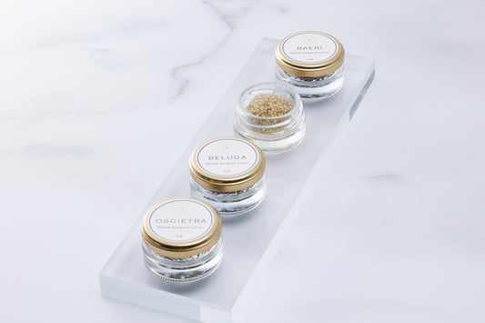 最高ランクのキャビア。成育に長い歳月を要する母体から生まれる希少な卵は、濃厚な熟成感と凝縮されたクリーミーな味わい。